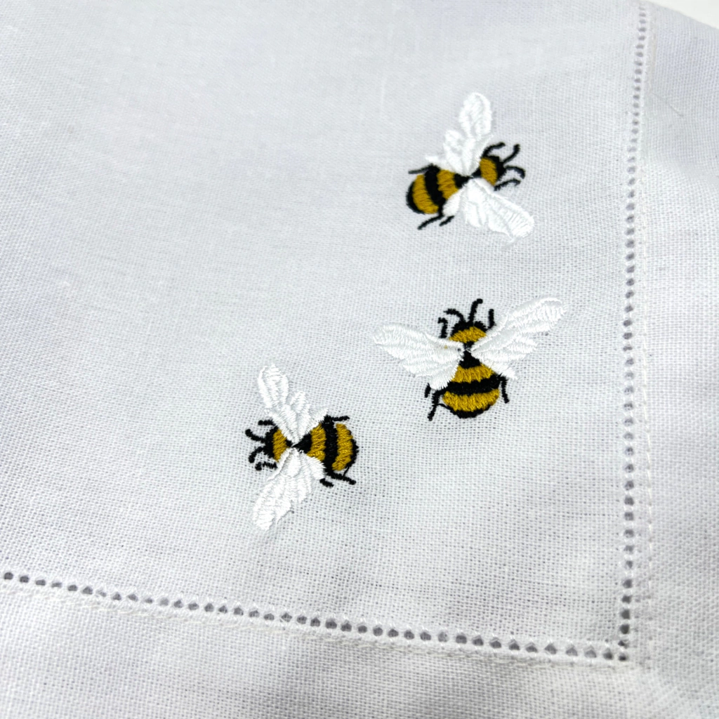Guardanapo de linho misto, acabamento em ponto ajour e bordado de abelhas.