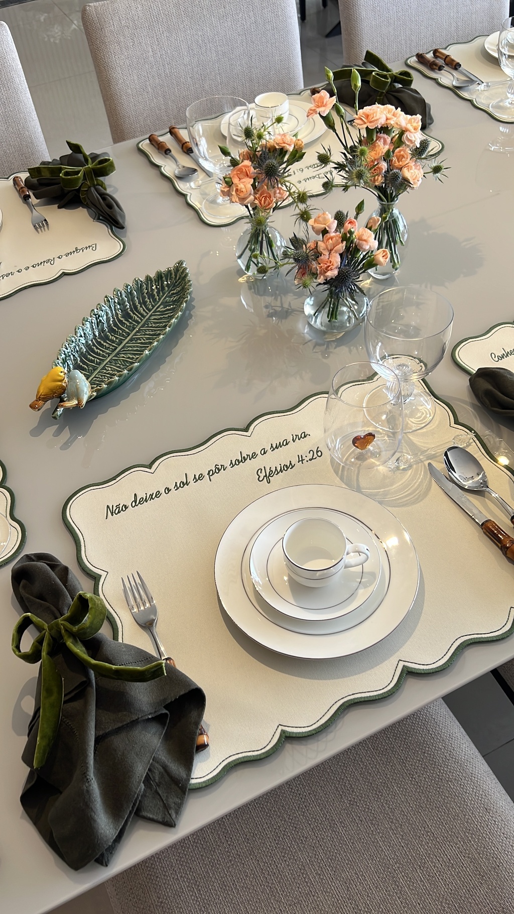 Jogo americano desenvolvido por Arte Etc Home,para a Coleção Motivos para Crer em Deus bordado em tecido 100% Poliéster IMPERMEÁVEL na cor branca. Dimensões: 38x49cm. Cor do bordado: VERDE MILITAR
